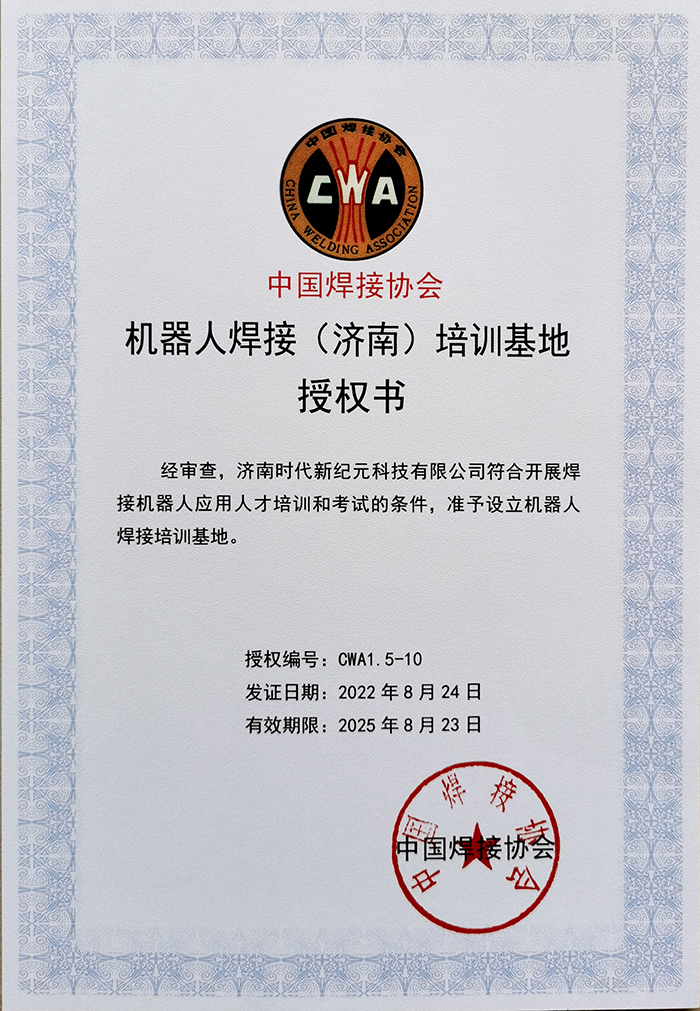 2022年8月24日上午,中國焊接協(xié)會(huì )機器人焊接(濟南)培訓基地授權續約儀式在濟南時(shí)代新紀元科技有限公司舉行。中國焊接協(xié)會(huì )副會(huì )長(cháng)兼秘書(shū)長(cháng)李連勝、副秘書(shū)長(cháng)吳九澎、教育與培訓工作委員會(huì )專(zhuān)家委主任戴建樹(shù)、教育與培訓工作委員會(huì )副秘書(shū)長(cháng)李波、教育與培訓工作委員會(huì )副秘書(shū)長(cháng)李月華等行業(yè)領(lǐng)導參加培訓基地續約儀式。參加活動(dòng)的時(shí)代公司領(lǐng)導包括:北京時(shí)代科技股份有限公司總經(jīng)理羅錦、機器人集成事業(yè)部總經(jīng)理付玉儉、焊接工藝實(shí)驗室主任張自祥等。